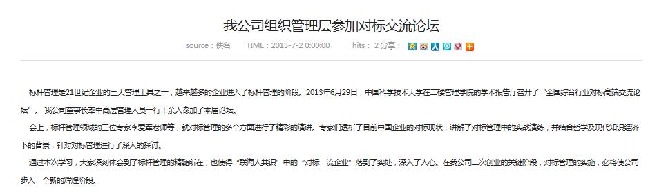 標(biāo)桿管理是21世紀(jì)企業(yè)的三大管理工具之一,越來越多的企業(yè)進(jìn)入了標(biāo)桿管理的階段。2013年6月29日,中國科學(xué)技術(shù)大學(xué)在二樓管理學(xué)院的學(xué)術(shù)報(bào)告廳召開了“全國綜合行業(yè)對(duì)標(biāo)高端交流論壇”。 我公司董事長....