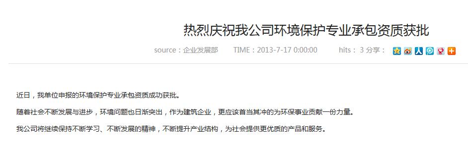 近日,我單位申報(bào)的環(huán)境保護(hù)專業(yè)承包資質(zhì)成功獲批。 隨著社會(huì)不斷發(fā)展與進(jìn)步,環(huán)境問題也日漸突出,作為建筑企業(yè),更應(yīng)該首當(dāng)其沖的為環(huán)保事業(yè)貢獻(xiàn)一份力量。...