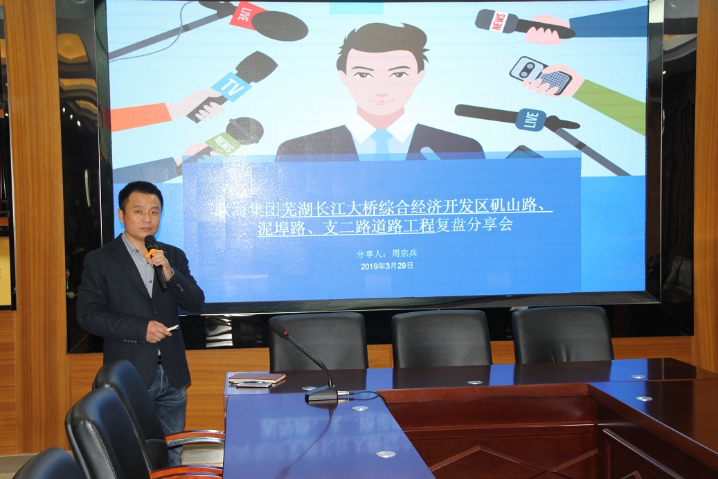2019年3月29日下午,由發展中心組織的2019年第二場項目復盤分享交流會在聯海集團五樓會議室舉行,本次復盤分享是由周宗兵同志帶來的《蕪湖長江大橋綜合經濟開發區磯山路、泥埠路、支二路道路工程復盤...