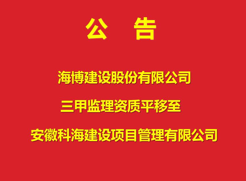 為推進集團公司工程建設組織方式改革,促進我司持續健康發展。經董事會研究決定,從能力培養、專業化培養的戰略部署角度出發,將海博建設股份有限公司資質類別中的監理資質平移至安徽科海建設項目管理....