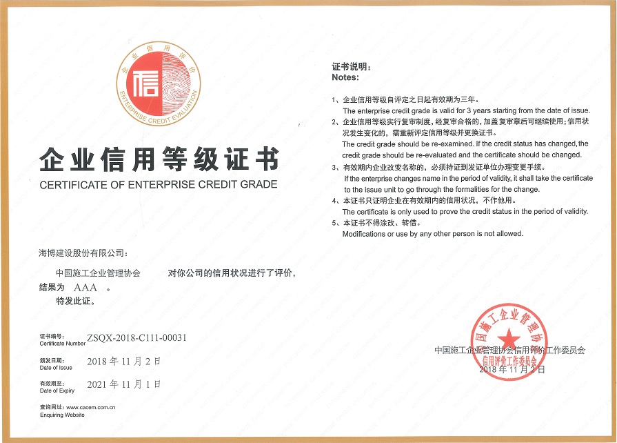 12月4日,從中國施工企業管理協會在北京召開的“2018年工程建設誠信企業推介大會”上傳來喜訊,在2018年度工程建設企業信用評價工作中,我司信用等級被評定“AAA”級,這是繼水利部給予評定的“AAA”級之后,榮獲的第二項國家主...