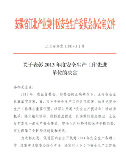 4月2日,安徽省江北產業集中區召開2014年第一次安全生產會議,我公司市政道路四期項目部在安全生產工作中表現突出,被集中區管委會、安委會授予“2013年度安全生產工作先進單位”榮譽稱號。