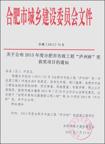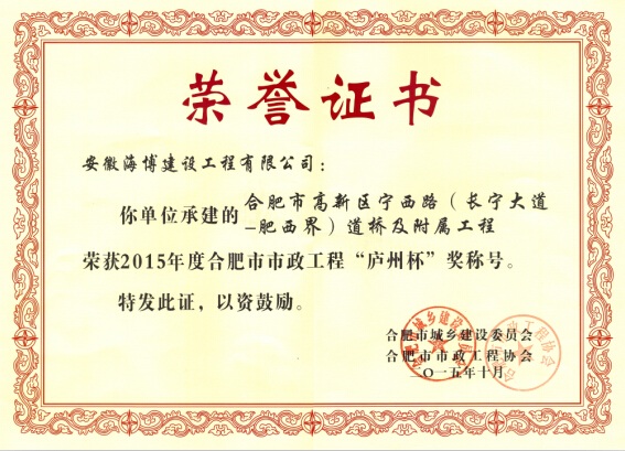 安徽海博建設工程有限公司喜獲2015年合肥市市政工程“廬州杯”獎