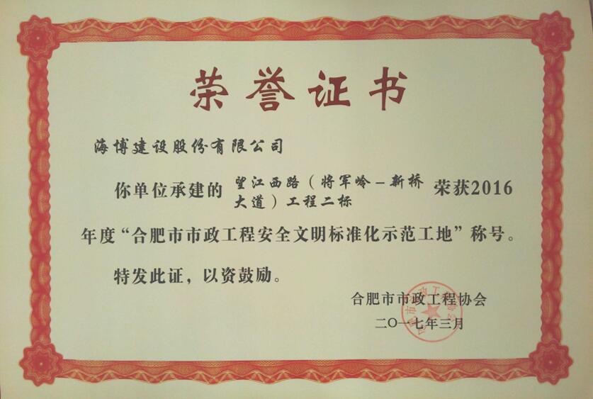 望江西路(將軍嶺路-新橋大道)建設工程二標是空港產(chǎn)業(yè)新城與主城區(qū)重要通道,該工程積極開展安全生產(chǎn)文明施工標準化管理成效顯著,近日榮獲合肥市2016年度“市政工程安全文明標準化示范工地”。同時,該工程受到合肥市公路管理局的高度評價,已經(jīng)通過“平安工地”的評審。
