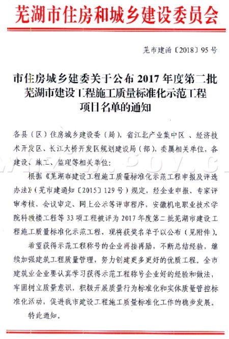 2017月12月15日,由蕪湖市、無為縣建設工程質(zhì)量監(jiān)督站及相應專家組成的評審組,按照《蕪湖市建設工程施工質(zhì)量標準化示范工程申報及評選辦法》(蕪市建通知[2015]129號),對該工程申報蕪湖市建設工程施工質(zhì)量標準化示范工程進行現(xiàn)場復審。