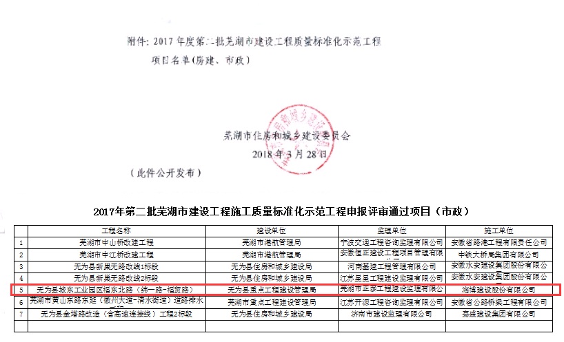 2018年03月28日,蕪湖市住房城鄉(xiāng)建委公布了我公司承建的無為縣城東工業(yè)園區(qū)福東北路(緯一路-福貿(mào)路)工程榮獲“2017年度第二批蕪湖市建設工程施工質(zhì)量標準化示范工程”稱號。