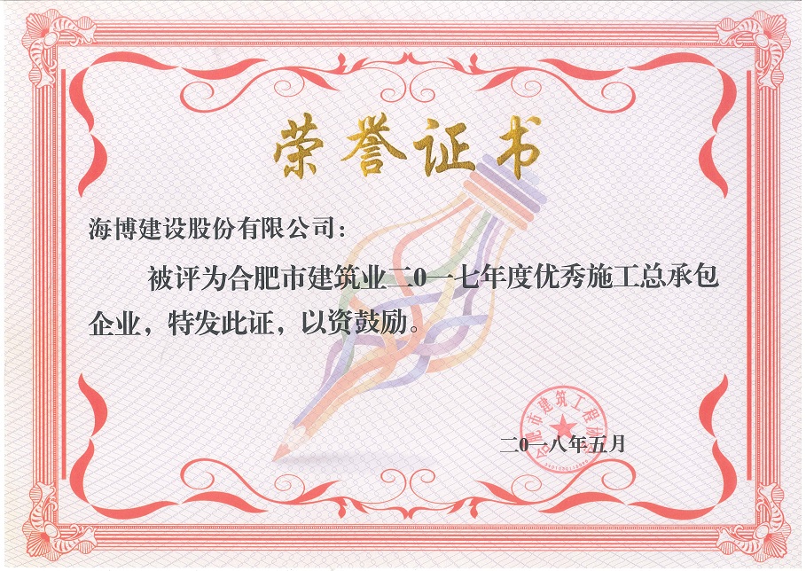 由朱海生秘書長宣讀了合建協【2017】15號《關于表彰全市建筑業2017年度優秀企業、單項先進企業、先進個人的決定》,我公司在此次優秀企業評選中再次獲得優秀施工總承包企業、優秀監理企業稱號,連續兩年獲得此項榮譽,這將更加增強我們海博人勇于爭先、砥礪奮進、堅定前行之斗志和信心。然后由潘孝艷副會長對“合肥市建筑工程優質結構獎”及“合肥市建筑施工安全生產標準化示范工地”評選辦法進行了修訂,明確了企業項目榮譽申報的方向及具體要求。