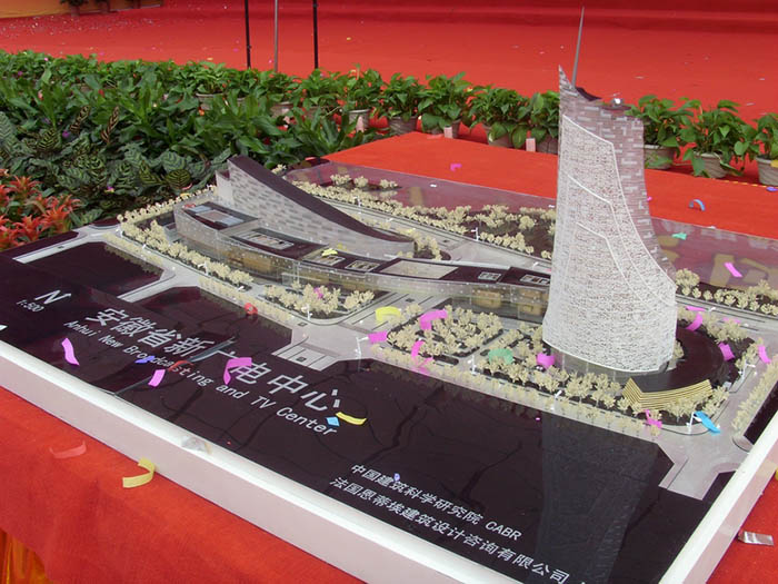 安徽省廣播電視新中心項目位于筆架山街道轄區內的祁門路與懷寧路西南角,西鄰藍蝶苑,北臨天鵝湖。主要由兩棟樓構成,東邊是49層的主樓,西邊是演播大廳和一個露天演藝廣場及一個高13層群樓, 東西兩幢樓之間由一座景觀橋連接,兩樓造型均為S型.項目包括省電臺、省電視臺、省傳輸總臺、省廣電傳媒產業集團和省網絡公司等單位的節目制作、播出、傳輸以及監控機房等。新中心占地273畝,將分兩期建設,一期建設26萬平方米,投資17億元;主樓高226.5米,建成后將成為合肥市最高建筑;廣電新中心3600平方米的演播廳,為國內最大的電視演播廳,將于明年10月1號投入使用。